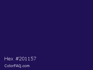 Hex #201157 Color is a very dark indigo color and the nearest color is Violent Violet #290c5e. Hex code #201157 and RGB value is rgb(32,17,87). In RGB color space, this color is composed of 13% red, 7% green, 34% blue, In CMYK color space, this color is composed of 63% cyan, 80% magenta, 0% yellow , 66% black , In HSL color space, this color has a hue angle of 253° , 67% saturation and 20% lightness.