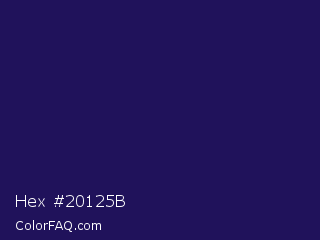 Hex #20125b Color is a very dark indigo color and the nearest color is Violent Violet #290c5e. Hex code #20125b and RGB value is rgb(32,18,91). In RGB color space, this color is composed of 13% red, 7% green, 36% blue, In CMYK color space, this color is composed of 65% cyan, 80% magenta, 0% yellow , 64% black , In HSL color space, this color has a hue angle of 252° , 67% saturation and 21% lightness.