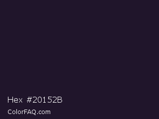 Hex #20152b Color is a very dark violet color and the nearest color is Mirage #161928. Hex code #20152b and RGB value is rgb(32,21,43). In RGB color space, this color is composed of 13% red, 8% green, 17% blue, In CMYK color space, this color is composed of 26% cyan, 51% magenta, 0% yellow , 83% black , In HSL color space, this color has a hue angle of 270° , 34% saturation and 13% lightness.