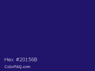 Hex #20156b Color is a dark indigo color and the nearest color is Lucky Point #1a1a68. Hex code #20156b and RGB value is rgb(32,21,107). In RGB color space, this color is composed of 13% red, 8% green, 42% blue, In CMYK color space, this color is composed of 70% cyan, 80% magenta, 0% yellow , 58% black , In HSL color space, this color has a hue angle of 248° , 67% saturation and 25% lightness.