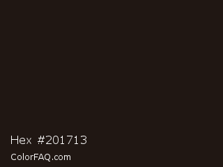 Hex #201713 Color is a very dark orange color and the nearest color is Eternity #211a0e. Hex code #201713 and RGB value is rgb(32,23,19). In RGB color space, this color is composed of 13% red, 9% green, 7% blue, In CMYK color space, this color is composed of 0% cyan, 28% magenta, 41% yellow , 87% black , In HSL color space, this color has a hue angle of 18° , 25% saturation and 10% lightness.