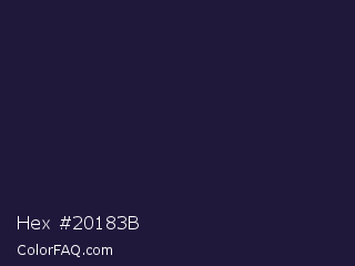 Hex #20183b Color is a very dark indigo color and the nearest color is Haiti #1b1035. Hex code #20183b and RGB value is rgb(32,24,59). In RGB color space, this color is composed of 13% red, 9% green, 23% blue, In CMYK color space, this color is composed of 46% cyan, 59% magenta, 0% yellow , 77% black , In HSL color space, this color has a hue angle of 254° , 42% saturation and 16% lightness.
