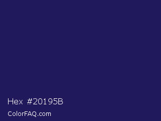 Hex #20195b Color is a dark indigo color and the nearest color is Port Gore #251f4f. Hex code #20195b and RGB value is rgb(32,25,91). In RGB color space, this color is composed of 13% red, 10% green, 36% blue, In CMYK color space, this color is composed of 65% cyan, 73% magenta, 0% yellow , 64% black , In HSL color space, this color has a hue angle of 246° , 57% saturation and 23% lightness.