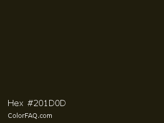 Hex #201d0d Color is a almost black yellow color and the nearest color is Eternity #211a0e. Hex code #201d0d and RGB value is rgb(32,29,13). In RGB color space, this color is composed of 13% red, 11% green, 5% blue, In CMYK color space, this color is composed of 0% cyan, 9% magenta, 59% yellow , 87% black , In HSL color space, this color has a hue angle of 51° , 42% saturation and 9% lightness.