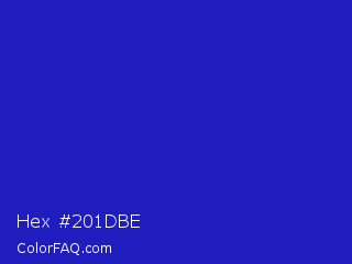 Hex #201dbe Color is a normal indigo color and the nearest color is Persian Blue #1c39bb. Hex code #201dbe and RGB value is rgb(32,29,190). In RGB color space, this color is composed of 13% red, 11% green, 75% blue, In CMYK color space, this color is composed of 83% cyan, 85% magenta, 0% yellow , 25% black , In HSL color space, this color has a hue angle of 241° , 74% saturation and 43% lightness.
