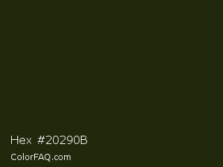 Hex #20290b Color is a very dark lime color and the nearest color is Deep Forest Green #182d09. Hex code #20290b and RGB value is rgb(32,41,11). In RGB color space, this color is composed of 13% red, 16% green, 4% blue, In CMYK color space, this color is composed of 22% cyan, 0% magenta, 73% yellow , 84% black , In HSL color space, this color has a hue angle of 78° , 58% saturation and 10% lightness.
