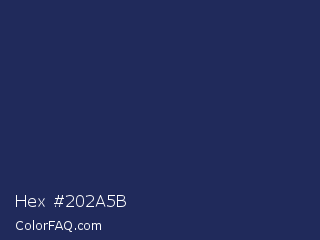 Hex #202a5b Color is a dark blue color and the nearest color is Cloud Burst #202e54. Hex code #202a5b and RGB value is rgb(32,42,91). In RGB color space, this color is composed of 13% red, 16% green, 36% blue, In CMYK color space, this color is composed of 65% cyan, 54% magenta, 0% yellow , 64% black , In HSL color space, this color has a hue angle of 230° , 48% saturation and 24% lightness.