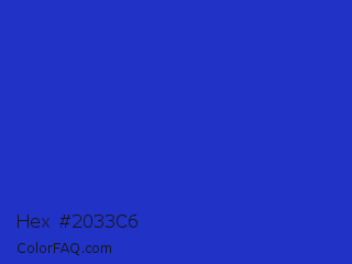 Hex #2033c6 Color is a normal blue color and the nearest color is Persian Blue #1c39bb. Hex code #2033c6 and RGB value is rgb(32,51,198). In RGB color space, this color is composed of 13% red, 20% green, 78% blue, In CMYK color space, this color is composed of 84% cyan, 74% magenta, 0% yellow , 22% black , In HSL color space, this color has a hue angle of 233° , 72% saturation and 45% lightness.