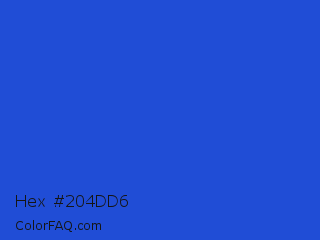 Hex #204dd6 Color is a normal blue color and the nearest color is New Car #214fc6. Hex code #204dd6 and RGB value is rgb(32,77,214). In RGB color space, this color is composed of 13% red, 30% green, 84% blue, In CMYK color space, this color is composed of 85% cyan, 64% magenta, 0% yellow , 16% black , In HSL color space, this color has a hue angle of 225° , 74% saturation and 48% lightness.