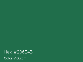 Hex #206e4b Color is a dark green color and the nearest color is Dark Spring Green #177245. Hex code #206e4b and RGB value is rgb(32,110,75). In RGB color space, this color is composed of 13% red, 43% green, 29% blue, In CMYK color space, this color is composed of 71% cyan, 0% magenta, 32% yellow , 57% black , In HSL color space, this color has a hue angle of 153° , 55% saturation and 28% lightness.