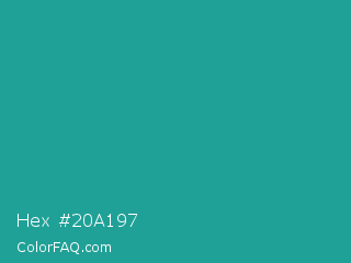 Hex #20a197 Color is a normal cyan color and the nearest color is Jungle Green #29ab87. Hex code #20a197 and RGB value is rgb(32,161,151). In RGB color space, this color is composed of 13% red, 63% green, 59% blue, In CMYK color space, this color is composed of 80% cyan, 0% magenta, 6% yellow , 37% black , In HSL color space, this color has a hue angle of 175° , 67% saturation and 38% lightness.