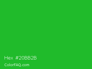 Hex #20bb2b Color is a normal green color and the nearest color is Wageningen Green #34b233. Hex code #20bb2b and RGB value is rgb(32,187,43). In RGB color space, this color is composed of 13% red, 73% green, 17% blue, In CMYK color space, this color is composed of 83% cyan, 0% magenta, 77% yellow , 27% black , In HSL color space, this color has a hue angle of 124° , 71% saturation and 43% lightness.