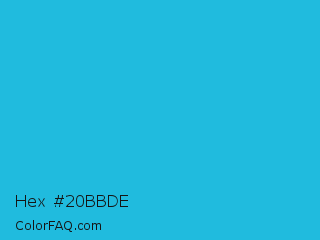 Hex #20bbde Color is a normal cyan color and the nearest color is Battery Charged Blue #1dacd6. Hex code #20bbde and RGB value is rgb(32,187,222). In RGB color space, this color is composed of 13% red, 73% green, 87% blue, In CMYK color space, this color is composed of 86% cyan, 16% magenta, 0% yellow , 13% black , In HSL color space, this color has a hue angle of 191° , 75% saturation and 50% lightness.