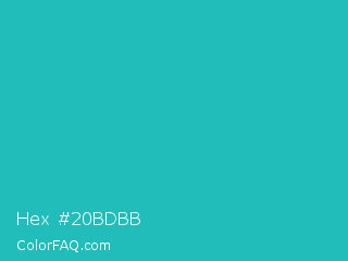 Hex #20bdbb Color is a normal cyan color and the nearest color is Java #1fc2c2. Hex code #20bdbb and RGB value is rgb(32,189,187). In RGB color space, this color is composed of 13% red, 74% green, 73% blue, In CMYK color space, this color is composed of 83% cyan, 0% magenta, 1% yellow , 26% black , In HSL color space, this color has a hue angle of 179° , 71% saturation and 43% lightness.