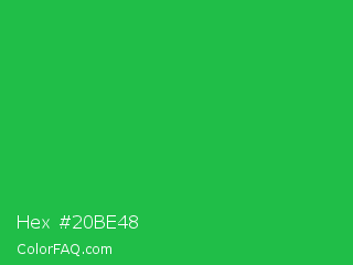 Hex #20be48 Color is a normal green color and the nearest color is Wageningen Green #34b233. Hex code #20be48 and RGB value is rgb(32,190,72). In RGB color space, this color is composed of 13% red, 75% green, 28% blue, In CMYK color space, this color is composed of 83% cyan, 0% magenta, 62% yellow , 25% black , In HSL color space, this color has a hue angle of 135° , 71% saturation and 44% lightness.