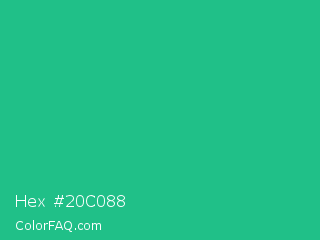 Hex #20c088 Color is a normal green color and the nearest color is Mountain Meadow Crayola #1ab385. Hex code #20c088 and RGB value is rgb(32,192,136). In RGB color space, this color is composed of 13% red, 75% green, 53% blue, In CMYK color space, this color is composed of 83% cyan, 0% magenta, 29% yellow , 25% black , In HSL color space, this color has a hue angle of 159° , 71% saturation and 44% lightness.