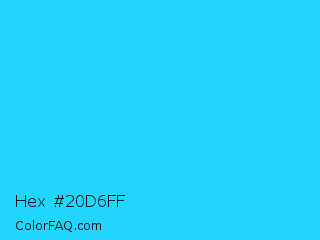 Hex #20d6ff Color is a normal cyan color and the nearest color is Spiro Disco Ball #0fc0fc. Hex code #20d6ff and RGB value is rgb(32,214,255). In RGB color space, this color is composed of 13% red, 84% green, 100% blue, In CMYK color space, this color is composed of 87% cyan, 16% magenta, 0% yellow , 0% black , In HSL color space, this color has a hue angle of 191° , 100% saturation and 56% lightness.