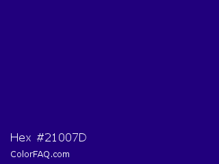 Hex #21007d Color is a dark indigo color and the nearest color is Deep Blue #220878. Hex code #21007d and RGB value is rgb(33,0,125). In RGB color space, this color is composed of 13% red, 0% green, 49% blue, In CMYK color space, this color is composed of 74% cyan, 100% magenta, 0% yellow , 51% black , In HSL color space, this color has a hue angle of 256° , 100% saturation and 25% lightness.