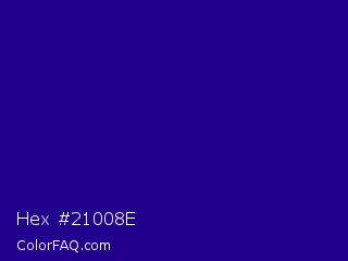 Hex #21008e Color is a dark indigo color and the nearest color is Blue Gem #2c0e8c. Hex code #21008e and RGB value is rgb(33,0,142). In RGB color space, this color is composed of 13% red, 0% green, 56% blue, In CMYK color space, this color is composed of 77% cyan, 100% magenta, 0% yellow , 44% black , In HSL color space, this color has a hue angle of 254° , 100% saturation and 28% lightness.