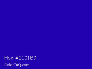 Hex #2101b0 Color is a normal indigo color and the nearest color is Interdimensional Blue #360ccc. Hex code #2101b0 and RGB value is rgb(33,1,176). In RGB color space, this color is composed of 13% red, 0% green, 69% blue, In CMYK color space, this color is composed of 81% cyan, 99% magenta, 0% yellow , 31% black , In HSL color space, this color has a hue angle of 251° , 99% saturation and 35% lightness.