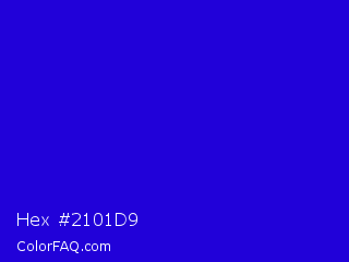 Hex #2101d9 Color is a normal indigo color and the nearest color is Interdimensional Blue #360ccc. Hex code #2101d9 and RGB value is rgb(33,1,217). In RGB color space, this color is composed of 13% red, 0% green, 85% blue, In CMYK color space, this color is composed of 85% cyan, 100% magenta, 0% yellow , 15% black , In HSL color space, this color has a hue angle of 249° , 99% saturation and 43% lightness.