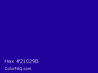 Hex #21029b Color is a normal indigo color and the nearest color is Ultramarine #120a8f. Hex code #21029b and RGB value is rgb(33,2,155). In RGB color space, this color is composed of 13% red, 1% green, 61% blue, In CMYK color space, this color is composed of 79% cyan, 99% magenta, 0% yellow , 39% black , In HSL color space, this color has a hue angle of 252° , 97% saturation and 31% lightness.