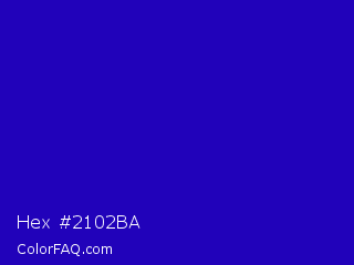 Hex #2102ba Color is a normal indigo color and the nearest color is Interdimensional Blue #360ccc. Hex code #2102ba and RGB value is rgb(33,2,186). In RGB color space, this color is composed of 13% red, 1% green, 73% blue, In CMYK color space, this color is composed of 82% cyan, 99% magenta, 0% yellow , 27% black , In HSL color space, this color has a hue angle of 250° , 98% saturation and 37% lightness.