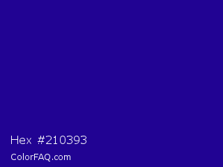 Hex #210393 Color is a dark indigo color and the nearest color is Ultramarine #120a8f. Hex code #210393 and RGB value is rgb(33,3,147). In RGB color space, this color is composed of 13% red, 1% green, 58% blue, In CMYK color space, this color is composed of 78% cyan, 98% magenta, 0% yellow , 42% black , In HSL color space, this color has a hue angle of 253° , 96% saturation and 29% lightness.