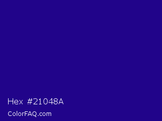 Hex #21048a Color is a dark indigo color and the nearest color is Blue Gem #2c0e8c. Hex code #21048a and RGB value is rgb(33,4,138). In RGB color space, this color is composed of 13% red, 2% green, 54% blue, In CMYK color space, this color is composed of 76% cyan, 97% magenta, 0% yellow , 46% black , In HSL color space, this color has a hue angle of 253° , 94% saturation and 28% lightness.
