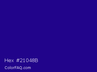 Hex #21048b Color is a dark indigo color and the nearest color is Blue Gem #2c0e8c. Hex code #21048b and RGB value is rgb(33,4,139). In RGB color space, this color is composed of 13% red, 2% green, 55% blue, In CMYK color space, this color is composed of 76% cyan, 97% magenta, 0% yellow , 45% black , In HSL color space, this color has a hue angle of 253° , 94% saturation and 28% lightness.