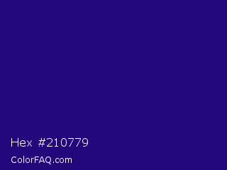 Hex #210779 Color is a dark indigo color and the nearest color is Deep Blue #220878. Hex code #210779 and RGB value is rgb(33,7,121). In RGB color space, this color is composed of 13% red, 3% green, 47% blue, In CMYK color space, this color is composed of 73% cyan, 94% magenta, 0% yellow , 53% black , In HSL color space, this color has a hue angle of 254° , 89% saturation and 25% lightness.