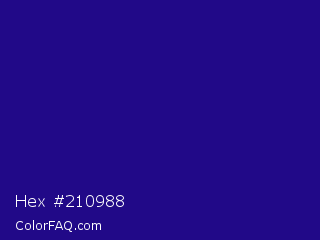 Hex #210988 Color is a dark indigo color and the nearest color is Blue Gem #2c0e8c. Hex code #210988 and RGB value is rgb(33,9,136). In RGB color space, this color is composed of 13% red, 4% green, 53% blue, In CMYK color space, this color is composed of 76% cyan, 93% magenta, 0% yellow , 47% black , In HSL color space, this color has a hue angle of 251° , 88% saturation and 28% lightness.