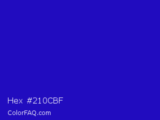 Hex #210cbf Color is a normal indigo color and the nearest color is Interdimensional Blue #360ccc. Hex code #210cbf and RGB value is rgb(33,12,191). In RGB color space, this color is composed of 13% red, 5% green, 75% blue, In CMYK color space, this color is composed of 83% cyan, 94% magenta, 0% yellow , 25% black , In HSL color space, this color has a hue angle of 247° , 88% saturation and 40% lightness.