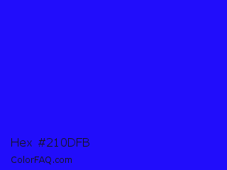 Hex #210dfb Color is a normal indigo color and the nearest color is Bluebonnet #1c1cf0. Hex code #210dfb and RGB value is rgb(33,13,251). In RGB color space, this color is composed of 13% red, 5% green, 98% blue, In CMYK color space, this color is composed of 87% cyan, 95% magenta, 0% yellow , 2% black , In HSL color space, this color has a hue angle of 245° , 97% saturation and 52% lightness.