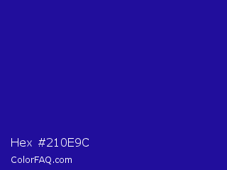 Hex #210e9c Color is a normal indigo color and the nearest color is Blue Gem #2c0e8c. Hex code #210e9c and RGB value is rgb(33,14,156). In RGB color space, this color is composed of 13% red, 5% green, 61% blue, In CMYK color space, this color is composed of 79% cyan, 91% magenta, 0% yellow , 39% black , In HSL color space, this color has a hue angle of 248° , 84% saturation and 33% lightness.