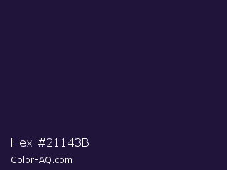 Hex #21143b Color is a very dark indigo color and the nearest color is Haiti #1b1035. Hex code #21143b and RGB value is rgb(33,20,59). In RGB color space, this color is composed of 13% red, 8% green, 23% blue, In CMYK color space, this color is composed of 44% cyan, 66% magenta, 0% yellow , 77% black , In HSL color space, this color has a hue angle of 260° , 49% saturation and 15% lightness.