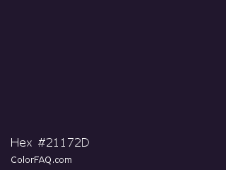 Hex #21172d Color is a very dark violet color and the nearest color is Revolver #2c1632. Hex code #21172d and RGB value is rgb(33,23,45). In RGB color space, this color is composed of 13% red, 9% green, 18% blue, In CMYK color space, this color is composed of 27% cyan, 49% magenta, 0% yellow , 82% black , In HSL color space, this color has a hue angle of 267° , 32% saturation and 13% lightness.
