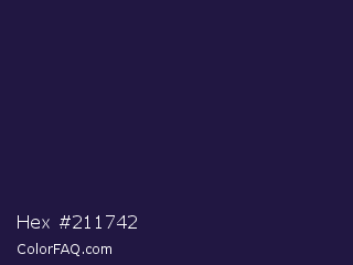 Hex #211742 Color is a very dark indigo color and the nearest color is Violet #240a40. Hex code #211742 and RGB value is rgb(33,23,66). In RGB color space, this color is composed of 13% red, 9% green, 26% blue, In CMYK color space, this color is composed of 50% cyan, 65% magenta, 0% yellow , 74% black , In HSL color space, this color has a hue angle of 254° , 48% saturation and 17% lightness.