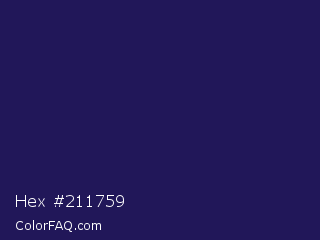 Hex #211759 Color is a very dark indigo color and the nearest color is Port Gore #251f4f. Hex code #211759 and RGB value is rgb(33,23,89). In RGB color space, this color is composed of 13% red, 9% green, 35% blue, In CMYK color space, this color is composed of 63% cyan, 74% magenta, 0% yellow , 65% black , In HSL color space, this color has a hue angle of 249° , 59% saturation and 22% lightness.
