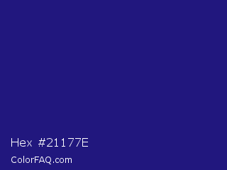 Hex #21177e Color is a dark indigo color and the nearest color is Deep Koamaru #1b127b. Hex code #21177e and RGB value is rgb(33,23,126). In RGB color space, this color is composed of 13% red, 9% green, 49% blue, In CMYK color space, this color is composed of 74% cyan, 82% magenta, 0% yellow , 51% black , In HSL color space, this color has a hue angle of 246° , 69% saturation and 29% lightness.
