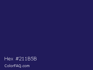 Hex #211b5b Color is a dark indigo color and the nearest color is Port Gore #251f4f. Hex code #211b5b and RGB value is rgb(33,27,91). In RGB color space, this color is composed of 13% red, 11% green, 36% blue, In CMYK color space, this color is composed of 64% cyan, 70% magenta, 0% yellow , 64% black , In HSL color space, this color has a hue angle of 246° , 54% saturation and 23% lightness.