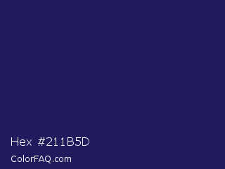 Hex #211b5d Color is a dark indigo color and the nearest color is Lucky Point #1a1a68. Hex code #211b5d and RGB value is rgb(33,27,93). In RGB color space, this color is composed of 13% red, 11% green, 36% blue, In CMYK color space, this color is composed of 65% cyan, 71% magenta, 0% yellow , 64% black , In HSL color space, this color has a hue angle of 245° , 55% saturation and 24% lightness.