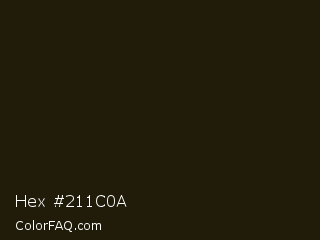 Hex #211c0a Color is a almost black yellow color and the nearest color is Eternity #211a0e. Hex code #211c0a and RGB value is rgb(33,28,10). In RGB color space, this color is composed of 13% red, 11% green, 4% blue, In CMYK color space, this color is composed of 0% cyan, 15% magenta, 70% yellow , 87% black , In HSL color space, this color has a hue angle of 47° , 53% saturation and 8% lightness.