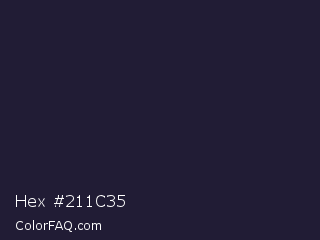 Hex #211c35 Color is a very dark indigo color and the nearest color is Steel Gray #262335. Hex code #211c35 and RGB value is rgb(33,28,53). In RGB color space, this color is composed of 13% red, 11% green, 21% blue, In CMYK color space, this color is composed of 38% cyan, 47% magenta, 0% yellow , 79% black , In HSL color space, this color has a hue angle of 252° , 31% saturation and 16% lightness.