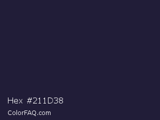 Hex #211d38 Color is a very dark indigo color and the nearest color is Steel Gray #262335. Hex code #211d38 and RGB value is rgb(33,29,56). In RGB color space, this color is composed of 13% red, 11% green, 22% blue, In CMYK color space, this color is composed of 41% cyan, 48% magenta, 0% yellow , 78% black , In HSL color space, this color has a hue angle of 249° , 32% saturation and 17% lightness.