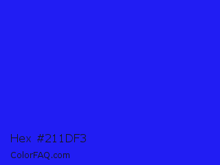 Hex #211df3 Color is a normal indigo color and the nearest color is Bluebonnet #1c1cf0. Hex code #211df3 and RGB value is rgb(33,29,243). In RGB color space, this color is composed of 13% red, 11% green, 95% blue, In CMYK color space, this color is composed of 86% cyan, 88% magenta, 0% yellow , 5% black , In HSL color space, this color has a hue angle of 241° , 90% saturation and 53% lightness.