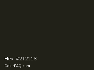 Hex #212118 Color is a very dark yellow color and the nearest color is Rangoon Green #1c1e13. Hex code #212118 and RGB value is rgb(33,33,24). In RGB color space, this color is composed of 13% red, 13% green, 9% blue, In CMYK color space, this color is composed of 0% cyan, 0% magenta, 27% yellow , 87% black , In HSL color space, this color has a hue angle of 60° , 16% saturation and 11% lightness.