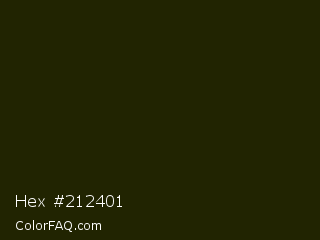 Hex #212401 Color is a almost black yellow color and the nearest color is Pine Tree #171f04. Hex code #212401 and RGB value is rgb(33,36,1). In RGB color space, this color is composed of 13% red, 14% green, 0% blue, In CMYK color space, this color is composed of 8% cyan, 0% magenta, 97% yellow , 86% black , In HSL color space, this color has a hue angle of 65° , 95% saturation and 7% lightness.