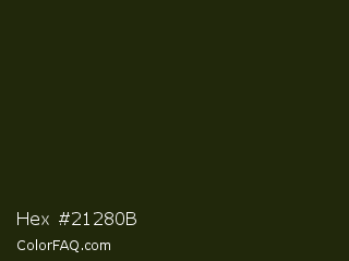Hex #21280b Color is a very dark lime color and the nearest color is Deep Forest Green #182d09. Hex code #21280b and RGB value is rgb(33,40,11). In RGB color space, this color is composed of 13% red, 16% green, 4% blue, In CMYK color space, this color is composed of 18% cyan, 0% magenta, 73% yellow , 84% black , In HSL color space, this color has a hue angle of 74° , 57% saturation and 10% lightness.