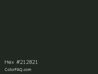 Hex #212821 Color is a very dark green color and the nearest color is Log Cabin #242a1d. Hex code #212821 and RGB value is rgb(33,40,33). In RGB color space, this color is composed of 13% red, 16% green, 13% blue, In CMYK color space, this color is composed of 18% cyan, 0% magenta, 18% yellow , 84% black , In HSL color space, this color has a hue angle of 120° , 10% saturation and 14% lightness.